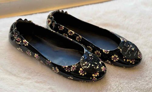 Tory Burch Size 7 Black Floral Flats Pre-Owned Shoes- Ladies
